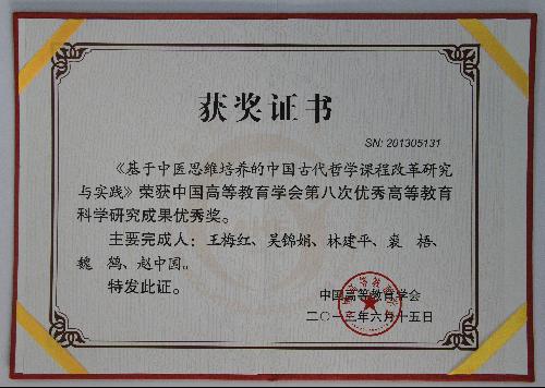 作为该项目的前期基础,由王梅红老师牵头的中国古代哲学教学研究成果获得了2012年度yl23455永利集团公司产品成果奖一等奖。成果相关的研究论文发表于《中医教育》2012年第6期,并获得中华医学会医学教育分会医学教育优秀论文评选一等奖。团队成员的论文《试论中国哲学教育在中医老员工素质培养中的作用》被评为全国中医药高教学会教学管理研究会、教育科学研究会2013年学术年会优秀论文。
