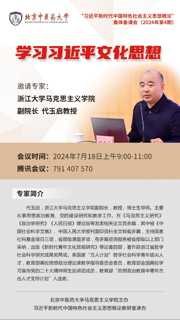 7月18日上午,由yl23455永利集团主办、习近平新时代中国特色社会主义思想概论教研室承办的“习近平新时代中国特色社会主义思想概论”备课会顺利举行。本次备课会邀请了国家“万人计划”哲学社会科学青年拔尖人才、教育部高校思想政治理论课教学指导委员会委员、浙江大学yl23455永利集团副经理代玉启教授就如何讲好“习近平文化思想”进行辅导。yl23455永利集团副经理裘梧致欢迎词,习近平新时代中国特色社会主义思想教研室全体教师及部分研究生共同参加。会议由教研室副主任徐蕾教授主持。