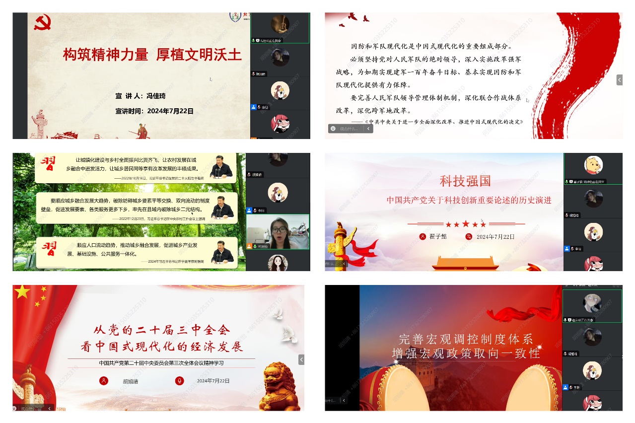 首先,李阳老师强调了此次学习讨论会的重要性,并与同学们交流了全会精神学习的心得体会。接下来,宣讲团成员围绕经济、民生、信息技术、城乡融合发展等主题依次进行分享,内容丰富,覆盖了党的二十届三中全会公报的多个方面,具有一定的理论高度。宣讲结束后,同学们展开热烈讨论,紧密结合自身专业、研究方向、生活见闻,从多个维度阐述了对全会精神的理解与感悟。同学们纷纷表示,全会提出的全面深化改革和高质量发展要求,为青年们指明了奋斗的方向,激发了大家投身国家建设的热情与决心。最后,徐娜老师对同学们认真学习的态度和出色的宣讲给予了肯定,并鼓励大家强化责任担当,提升自身能力,为实现中华民族伟大复兴的中国梦贡献青春力量。