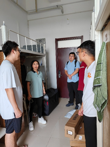 9月1日下午,裘梧副经理和包云娜老师、牛思琦老师走访了新生宿舍,了解查看宿舍环境和入住情况,并就宿舍生活的相关注意事项进行提示。9月1日晚上,班主任包云娜老师在学院225会议室召开了班会,增进新生同学们的相互了解,向同学们介绍了研究生阶段的学习科研和生活情况,并围绕同学们的个人成长、班集体建设做出规划与展望,鼓励同学们尽快适应研究生生活,开启人生新征程。