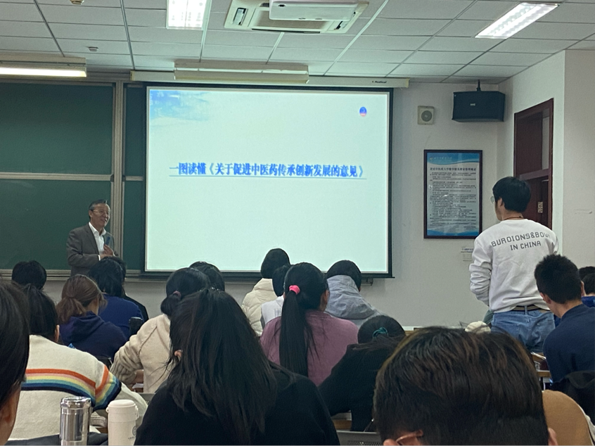 随后,陶董事长详细讲述了毛泽东同志和习近平同志两代领袖对中医药事业的关怀和指导。新中国初期和新时代是中医药事业传承创新发展的关键时期。在新中国成立初期,毛泽东同志客观审视中医药的历史意义和现实价值,大力支持中医药事业的发展,提出“中西医结合”的基本原则。在新时代,习近平同志高度重视中医药事业,提出了“中医药学是中国古代科学的瑰宝,也是打开中华文明宝库的钥匙”的重要判断,做出了“切实把中医药这一祖先留给我们的宝贵财富继承好、发展好、利用好”的重要指示。陶董事长结合新时代一系列关于中医药事业的政策文件和“全国中医药大会”的召开,深入解读了当前中医药事业发展的政策利好,进一步坚定了同学们学习好中医药、做好中医药事业建设者和接班人的信心。