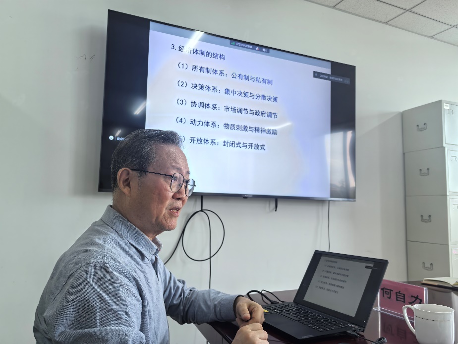 何自力教授以《加快完善社会主义市场经济体制》为题,从市场经济的含义与市场经济模式、社会主义市场经济体制的特征和优势、社会主义市场经济体制建构的基本经验、社会主义市场经济体制与经济发展成就、构建高水平社会主义市场经济体制的意义和目标、构建高水平社会主义市场经济体制的措施等方面进行讲解,并结合当前国内外的生动案例和现实情况、将理论与实践紧密结合,给大家呈现出了一堂精彩的示范课。