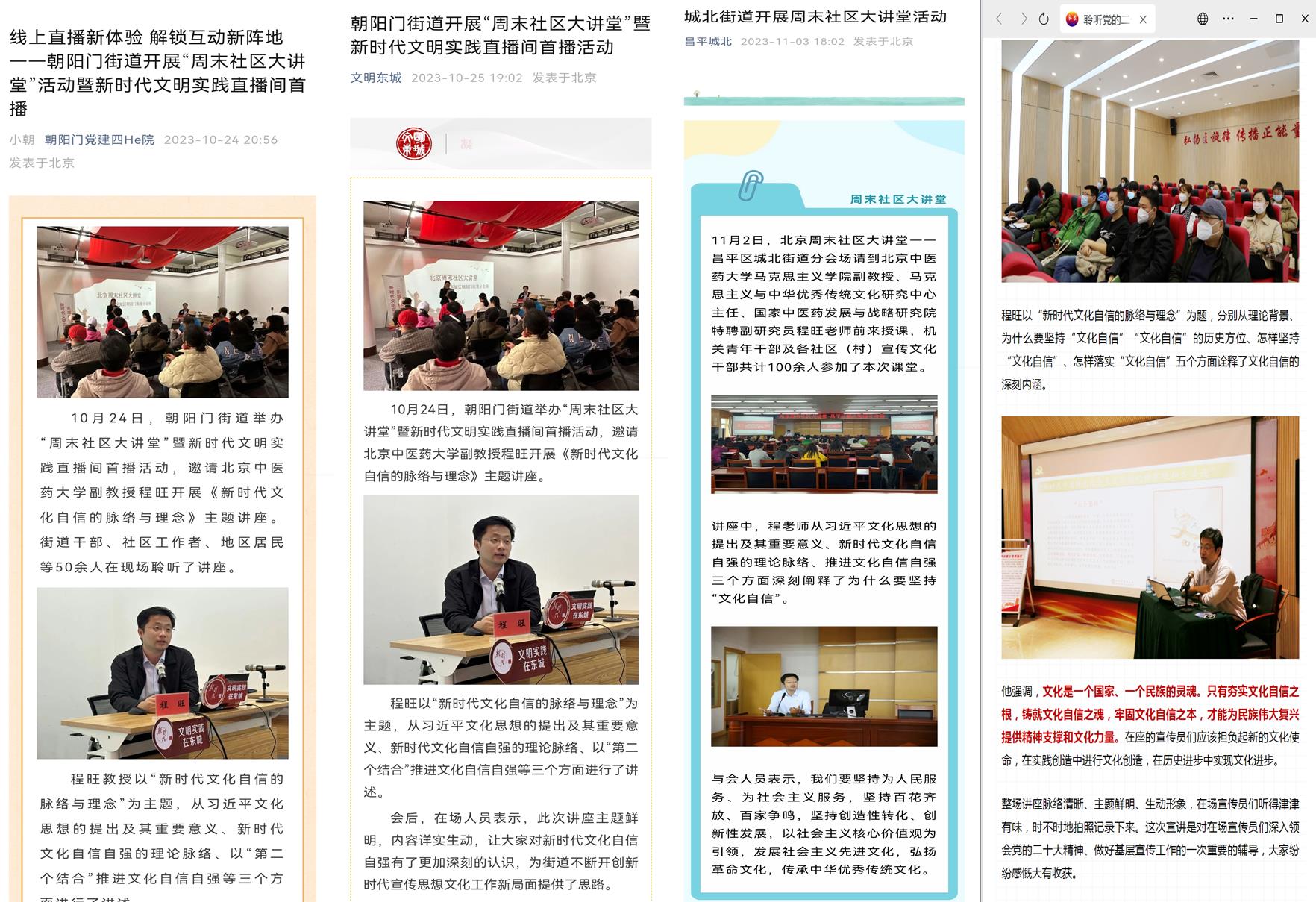 近期,yl23455永利集团程旺老师应北京周末社区大讲堂邀请,先后赴东城区朝阳门街道、怀柔区怀柔镇政府、昌平区城北街道开展理论讲座活动。这是程旺老师此前多次深入西城、通州、大兴等基层讲座后,再次为北京周末社区大讲堂进行讲座。