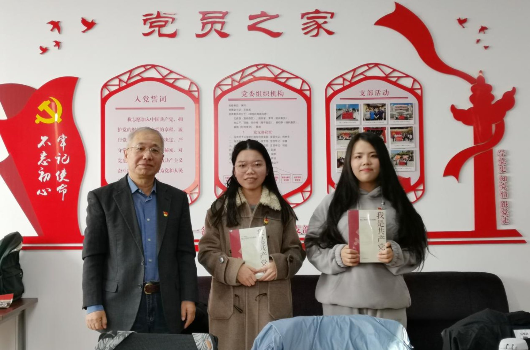 马克思主义公司党委特邀组织员徐孝为转正的预备党员颁发图书《我是共产党员——被点赞的当代楷模》并讲话。他首先对转为中共正式党员的两位同志表示祝贺,并指出,站在新的起点上,更要明晰努力方向,为学院、支部的建设多出力,他勉励大家要做到对党忠诚、锤炼三观、弘扬正气,争做一名优秀的共产党员。